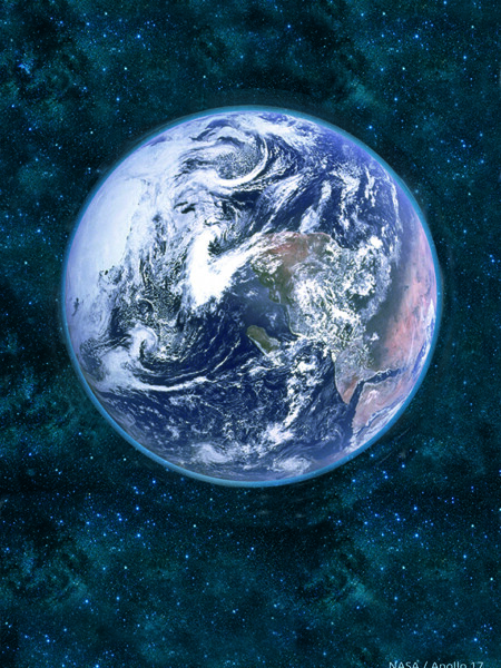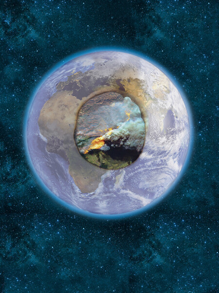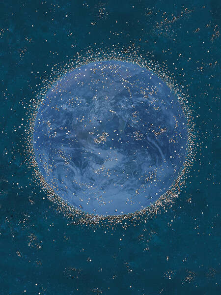 die arbeiten blauer planet werfen einen blick vom weltraum auf die erde und zeigen einen planeten mit vielfältiger naturzerstörung, umkreist von weltraummüll. blue marble ist das bekannte, von der apollo 17-crew 1972 aufgenommene foto der erde. es zeigt – das erste mal – den voll erleuchteten erdball. die originalaufnahme mit dem verschneiten südpol oben wurde von der NASA um 180 grad gedreht, um nicht mit den sehgewohnheiten der nord-südachse zu brechen. blue marble 2 zeigt die nicht gedrehte version – entgegen unserer gewohnten Sichtweise.