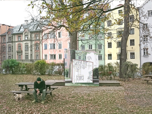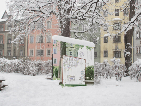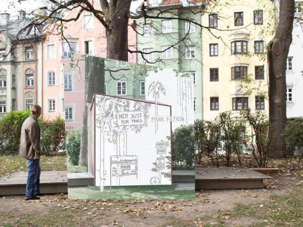 die plakatinstallation thematisiert den park als ausgangs- und ausverhandlungsort für demokratische prozesse und selbstermächtigung. transparente, slogans und symbole von zeitlich und örtlich unterschiedlichen kämpfen um die erhaltung oder errichtung von parks sind auf dem plakat zusammengefügt. als digitale zeichnung heben sie sich vom fotografischen bildteil ab, gehen über den lokalen pavillon hinaus und stellen people’s park in berkeley 1969, park fiktion in hamburg 1994-97, adolf picherplatz-park in innsbruck 2000 und gezi-park in istanbul 2013 zur diskussion. all diesen auseinandersetzungen gemeinsam ist der protest gegen die verwandlung der stadt in ein anlageobjekt für (globales) kapital. es geht um das recht auf stadt, auf öffentliche räume, auf plätze und parks, auf teilhabe und gestaltung.die einbeziehung des realen ortes ermöglicht den betrachterinnen ein spiel mit abbild und wirklichkeit und verweist darauf, dass wirklichkeit keine unverrückbare tatsache ist, sondern eine aufforderung zum handeln.