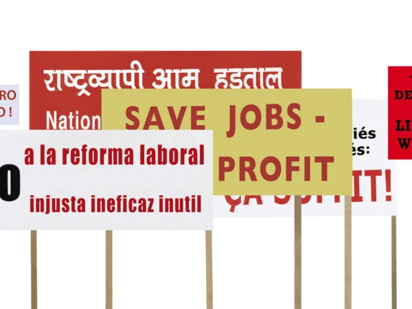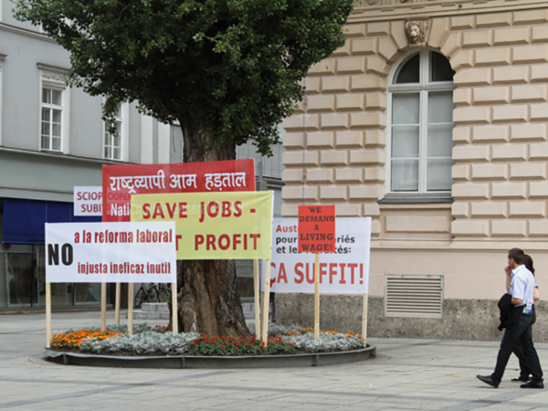 die arbeit im öffentlichen raum nimmt das thema der ausstellung – arbeitsbedingungen, arbeitskonflikte und widerstand – auf, verläßt jedoch den museumskontext. transparente mit forderungen und slogans in verschiedenen sprachen aus verschiedenen ländern werden am vorplatz des museums während der ausstellungsdauer aufgestellt. die proteste, die sich auf den straßen und plätzen formieren, kommen dorthin zurück.