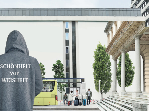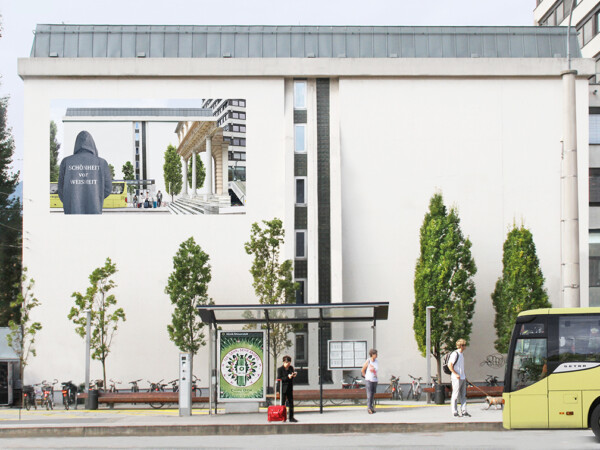 schönheit:weisheit verbindet über sechs monate die universität innsbruck mit dem landesmuseum ferdinandeum, zwei zentrale orte für wissenschaft und kunst in tirol. raum- und zeitverschiebungen, realität und fiktion, sowie architekturelemente beider institutionen sind bestandteile der großformatige arbeit am bücherspeicher der universitätsbibliothek. ins bild hinein führt eine figur, bekleidet mit einem kapuzenshirt, das häufig bei sprayern und politischen aktivisten verwendung findet. das sweatshirt trägt die aufschrift „schönheit vor weisheit“ und verweist damit an der universität auf die ausstellung im landesmuseum.