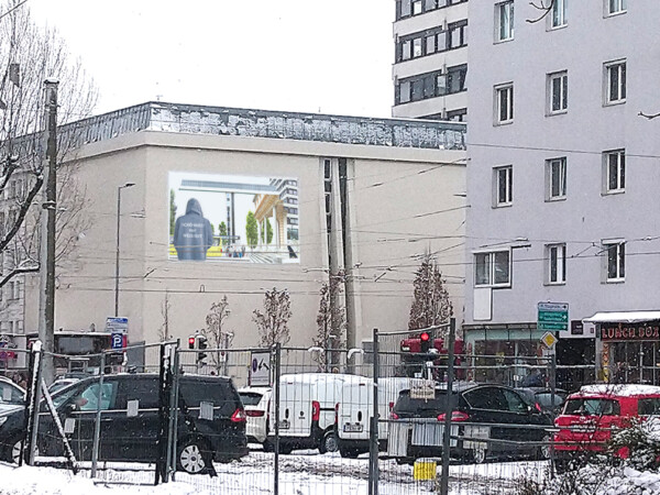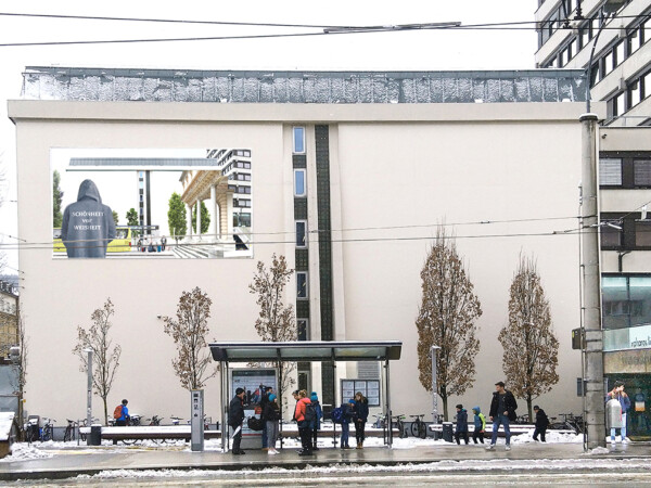 plakatprojekt, 850 x 500 cm, am bücherspeicher der universitätsbibliothek im rahmen der ausstellung “schönheit vor weisheit” im landesmuseum ferdinandeum, universitätskreuzung, innsbruck, 2019/20