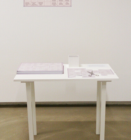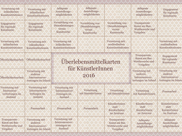 überlebensmittelkarten 2016 nimmt bezug auf die im jahr 1946 formulierte aufgabe der künstlerschaft als „wirtschaftliche notgemeinschaft“, wo „ nur künstler, die der berufsvereinigung angehörten, zum bezug von lebensmittelkarten berechtig waren…..“ (hirn 1980, s. 219). die installationspannt einen bogen von damals zur gegenwart und thematisiert die aufgabe einer künstlerInnenvereinigung im 21. jhdt. während es 1946 um das existenzielle überleben ging, stellt sich die überlebensfrage für künstlerInnen in einer zeit des konkurrenzdrucks, der globalisierung und kapitalisierung anders. in anlehnung an die lebensmittelkarten während und nach dem 2. weltkrieg wird ein exemplar der überlebensmittelkarten für künstlerInnen im ausstellungsraum aufgehängt und ein stapel dieser karten auf einem tisch aufgelegt. ähnlich der damaligen praxis können sich künstlerinnen dringend benötigte überlebensmittel ausschneiden, individuellen wünsche hinzufügen und zur einlösung in der künstlerschaft abgeben. dieser selbstreflexive aspekt ist anläßlich eines 70-jahr- jubiläums ein wichtiger impuls, um über künftige aufgaben und ziele einer interessensvertretung nachzudenken.
